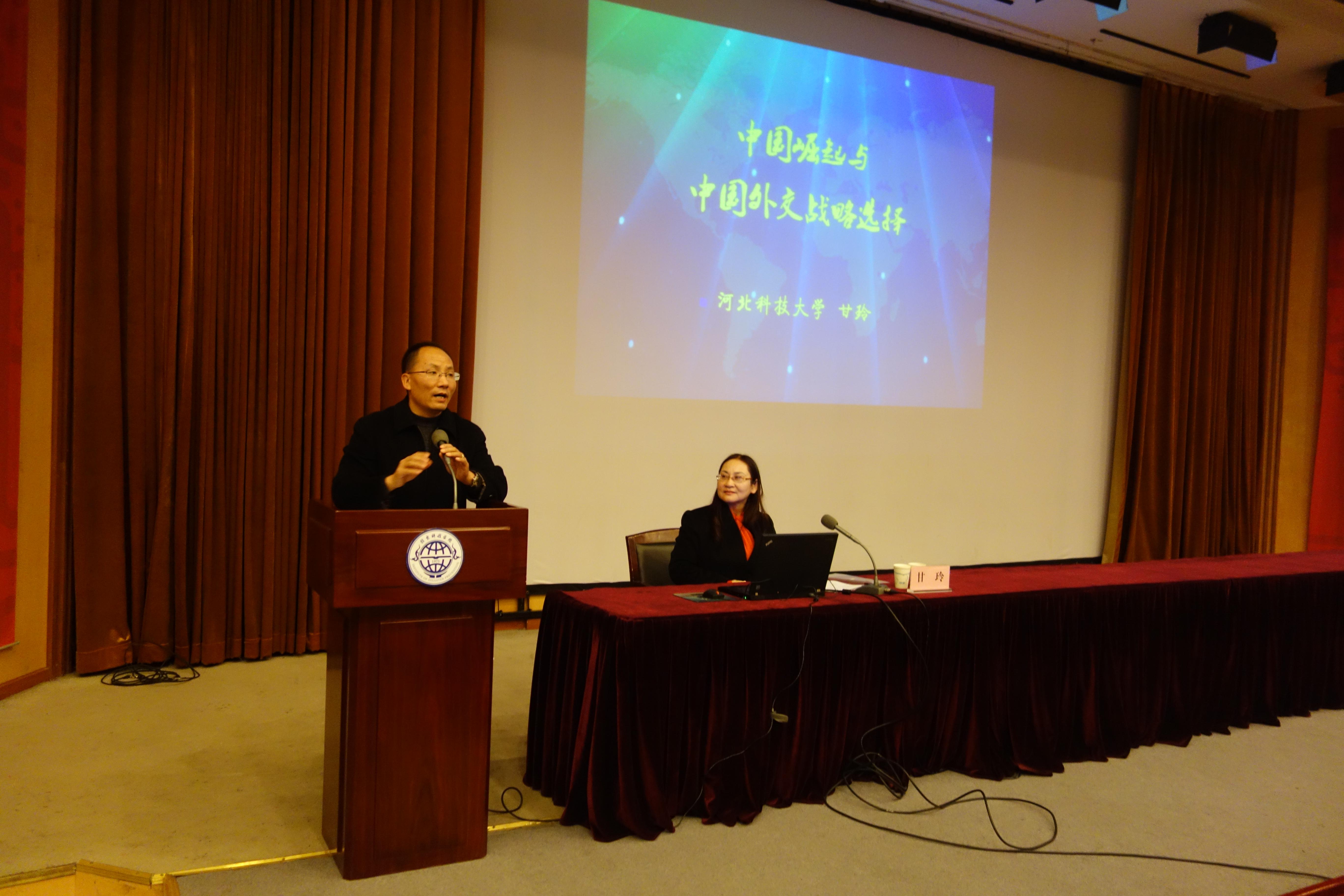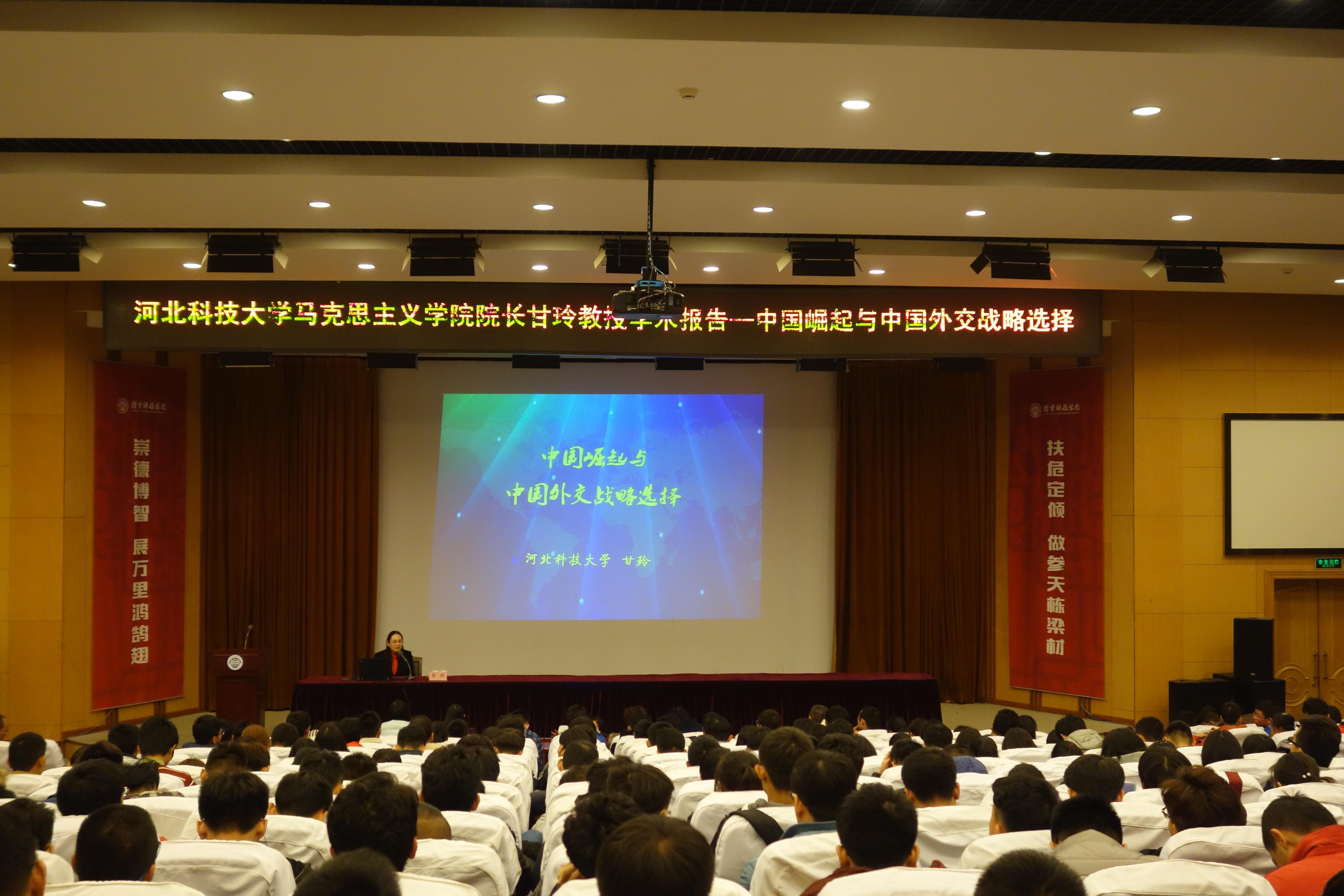 2016年11月4日,应思政部邀请,全国高校思政课教学指导委员会委员、河北科技大学qy球友会官网院长甘玲教授在图书馆报告厅给我院400余名师生作了题为“中国崛起和中国外交战略选择”的时事报告。报告从中国崛起面临的形势与挑战、中美两大国的碰撞与竞争、中国外交从危机管理到战略推动三个方面,深刻解析了中国和平发展所面临的复杂严峻的国际形势和我们积极主动的应对战略,报告站位高、思路清、内容丰、案例精、分析透,使听讲者深受教益。