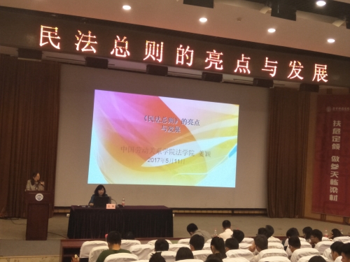 民法是我国法律体系中最为重要的基本法之一。是调整平等民事主体之间人身关系和财产关系的法律规范。2017年3月15日第十二届全国人民代表大会第五次会议通过的《民法总则》是我法治建设进程中非常重要的大事件,也是我国依法治国、建设社会主义法治国家的重要举措和阶段性成果。为了让我院学生更加了解《民法总则》的基本精神和相关规定,2017年5月11日下午,思政部邀请中国劳动关系qy球友会官网法qy球友会官网院长姜颖教授来我院,在图书馆报告厅为我院学生做题为“民法总则的亮点与发展”的专题讲座。